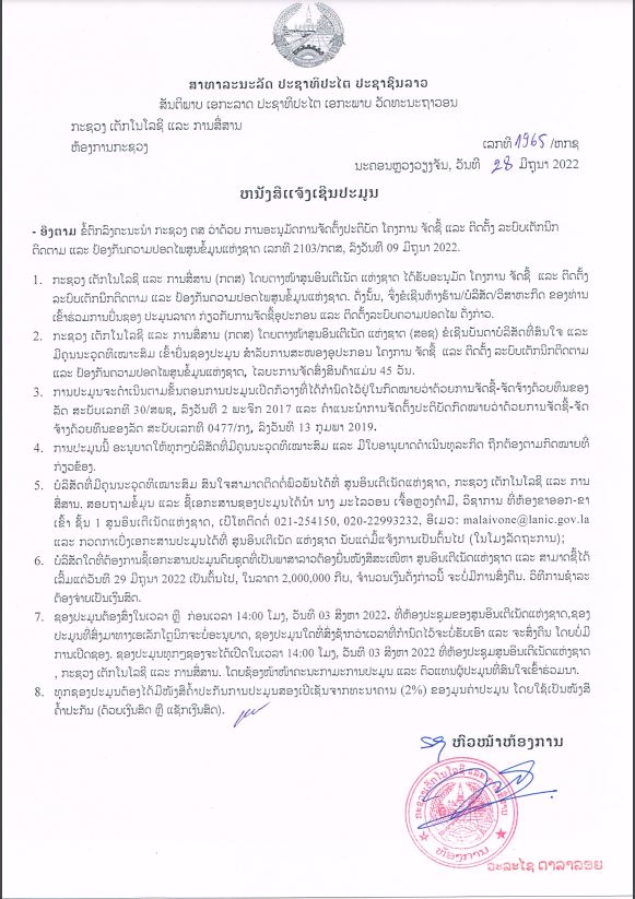 ຂໍເຊີນບັນດາບໍລິສັດ ທີ່ມີຄວາມສົນໃຈ ໃນການຢືນຊ່ອງປະມູນໂຄງການ ການຈັດຊື້ ແລະ ຕິດຕັ້ງລະບົບເຕັກນິກຕິດຕາມ ແລະ ປ້ອງກັນຄວາມປອດໄພ ສູນຂໍ້ມູນແຫ່ງຊາດ ເຊີ່ງຈະເລີ່ມຂາຍຊອງປະມູນ ໃນວັນທີ 29 ມິຖຸນາ ຈົນເຖິງ 03 ສິງຫາ 2022 ນີ້ ທີ່ ສູນອິນເຕີເນັດ ແຫ່ງຊາດ ບ້ານສາຍລົມ ເມືອງຈັນທະບູລີ